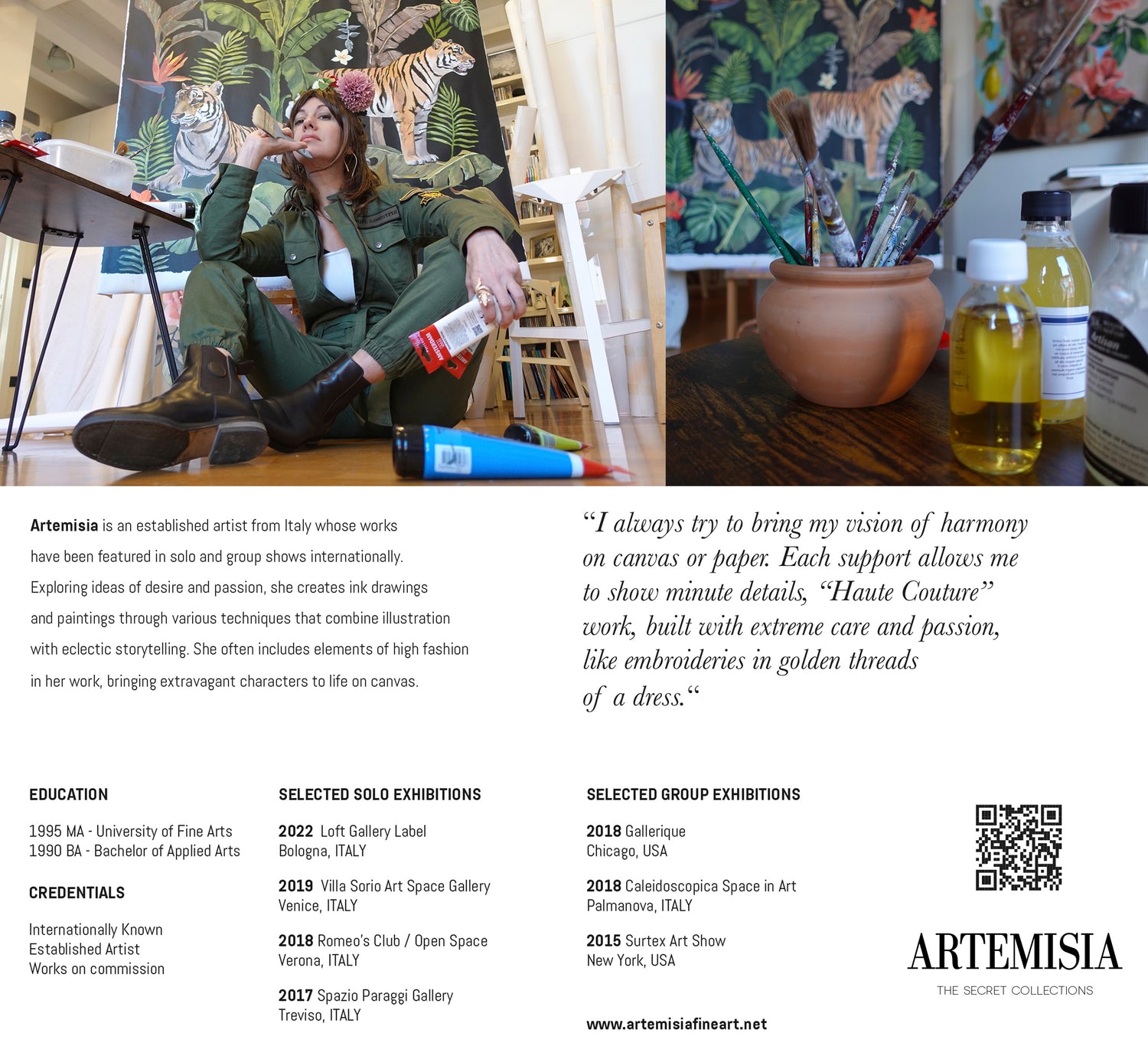 Artemisia is a contemporary artist working and living in Italy. Her unique style is influenced by glamour and a free-spirited lifestyle.