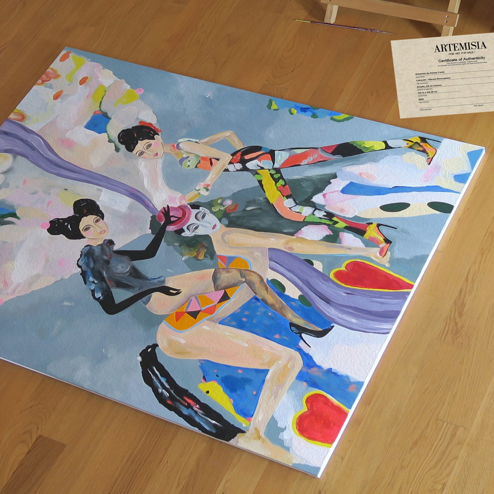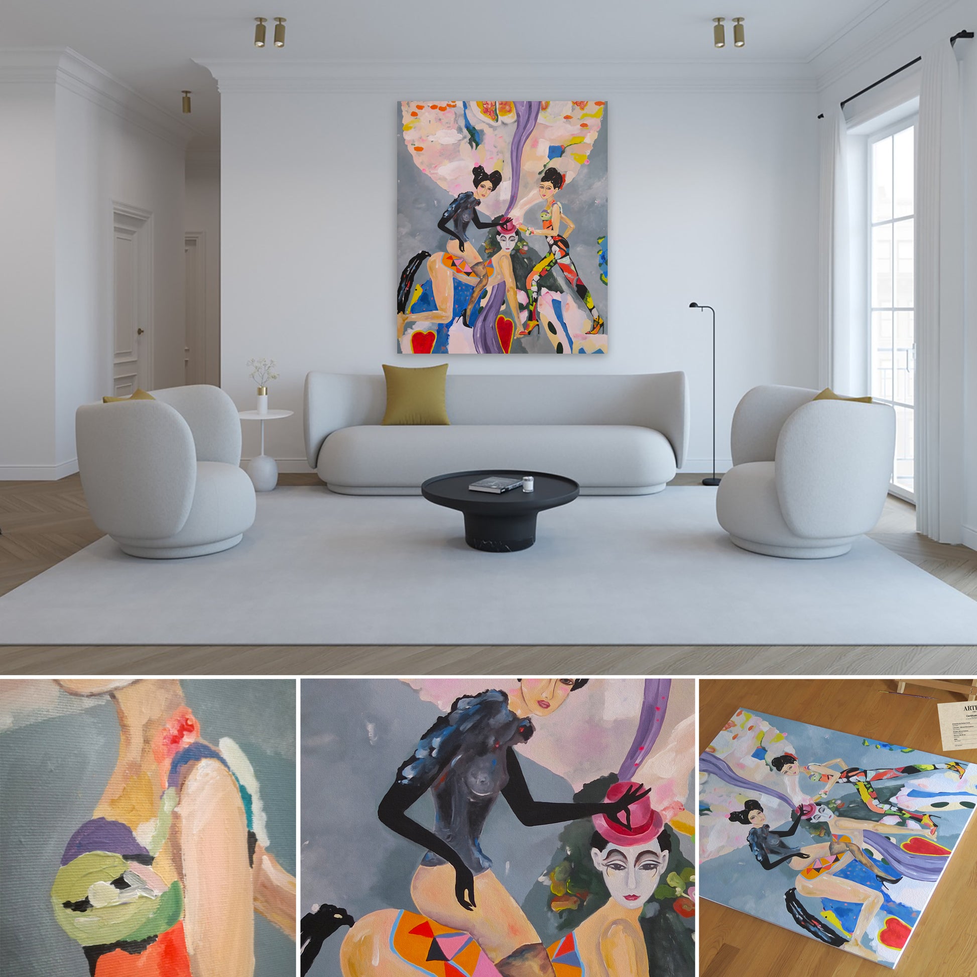 Dimensions are 120H x 100L cm, with 4-5 cm white canvas borders for assembly. Large scale Cabarete composition painting on Canvas. Satin Matt Varnished UV protection.