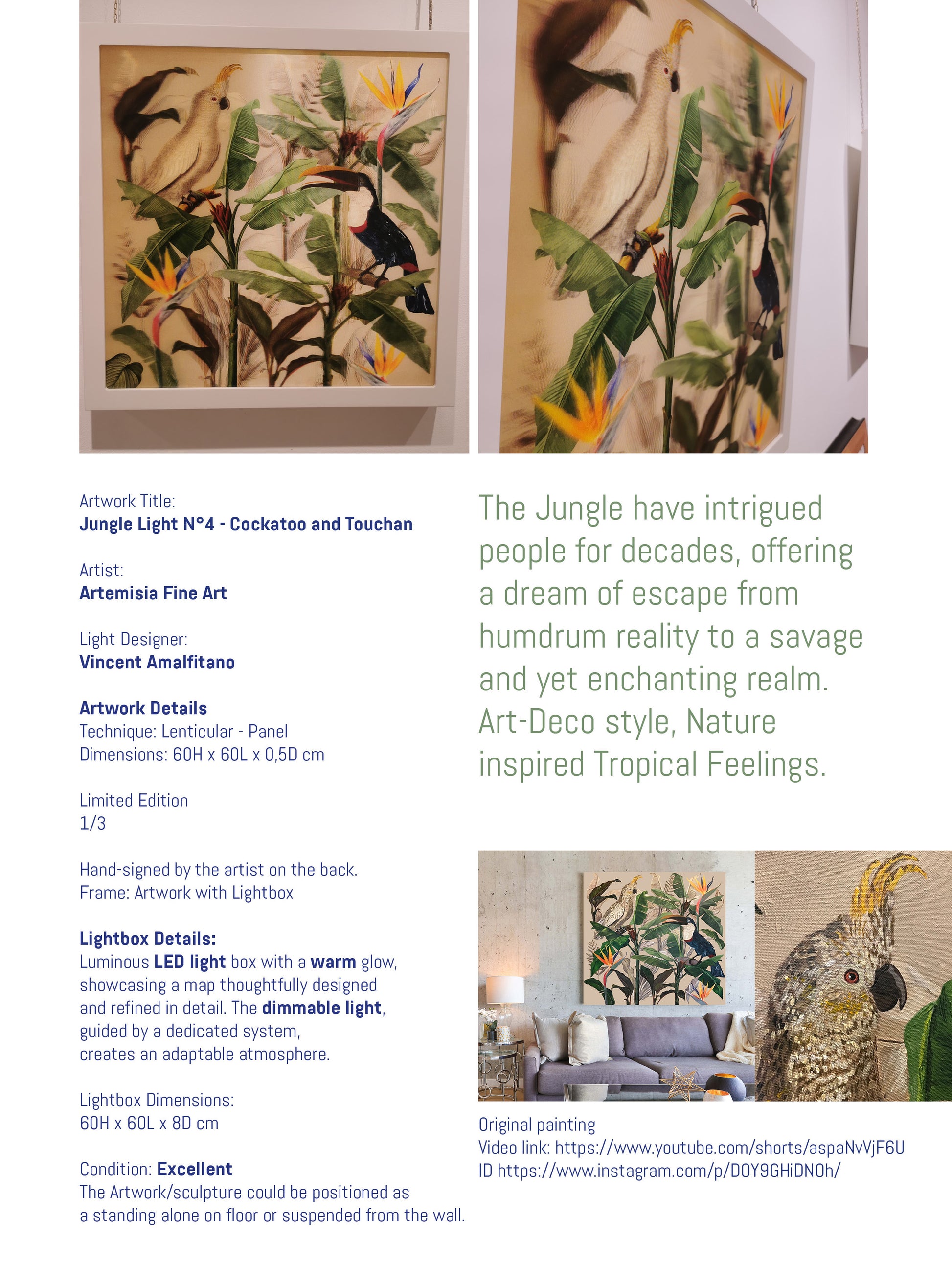 Integrated Lighting System: each work is equipped with a mapped lighting design, dimmable via soft-touch and remotely controlled, specifically developed to highlight the play of light and movement inherent to lenticular art, seamlessly adaptable to sophisticated environments and perfectly aligned with the elegance and innovation of your projects.