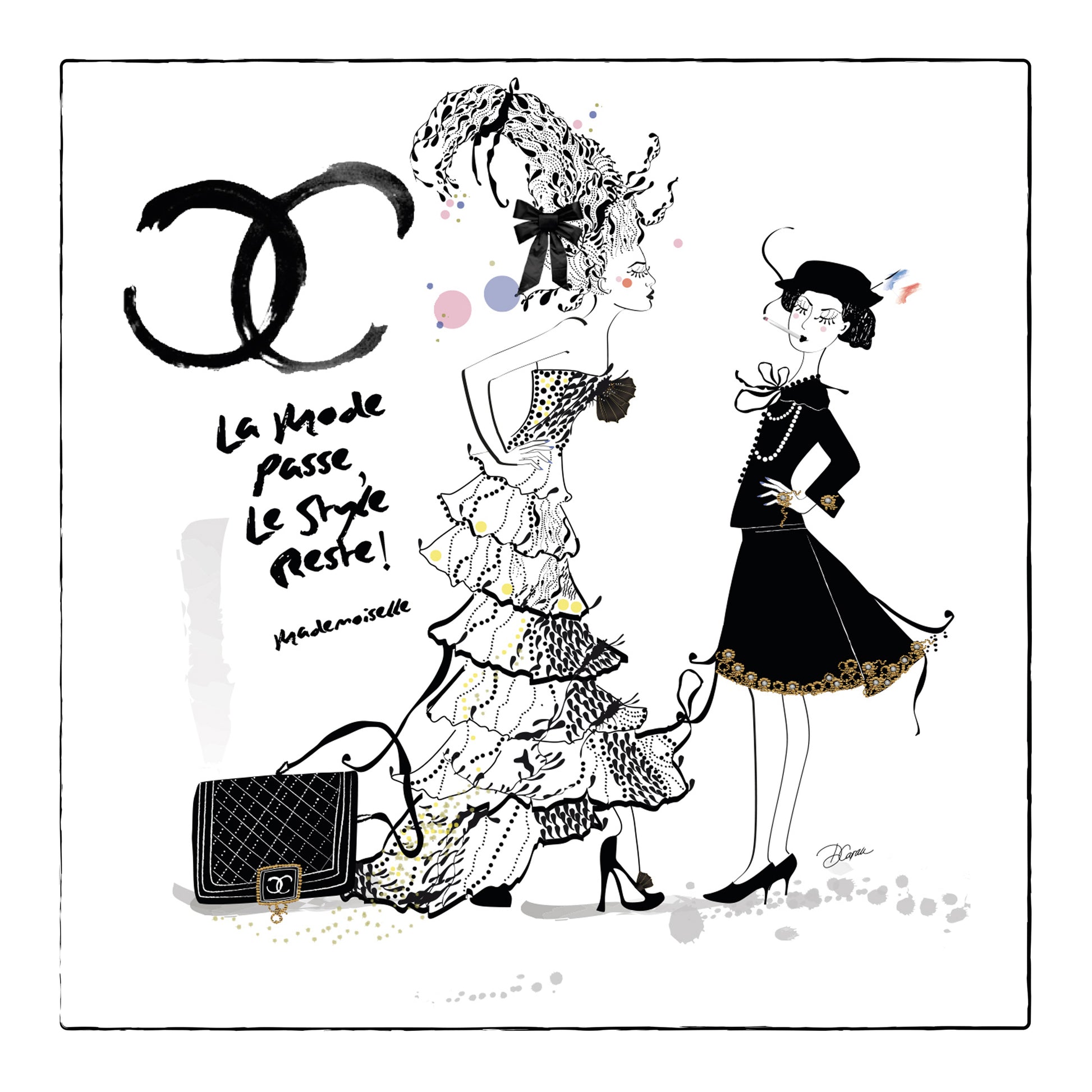 Coco Chanel, Gabrielle the world-famous French fashion designer The French Kiss Art Collection, one of a kind, Original Artwork. Drawn using fine line black pen mixed technique and media. The perfect gift!