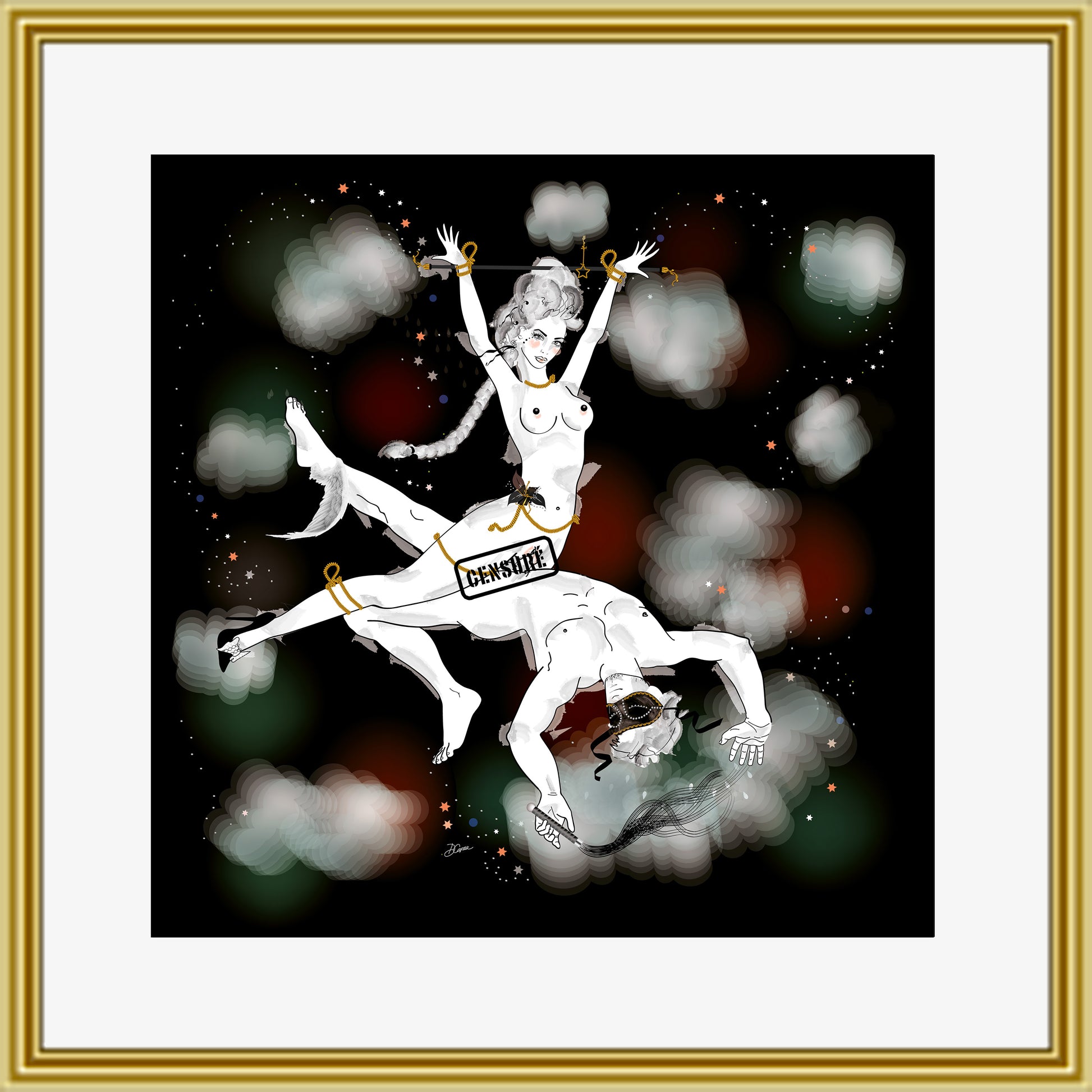 Giclée Art Print of Authentic piece made with passion and golden embroidery details. Playful illustration in bdsm style. The Artprint comes with certificate of authenticity signed by Artemisia.