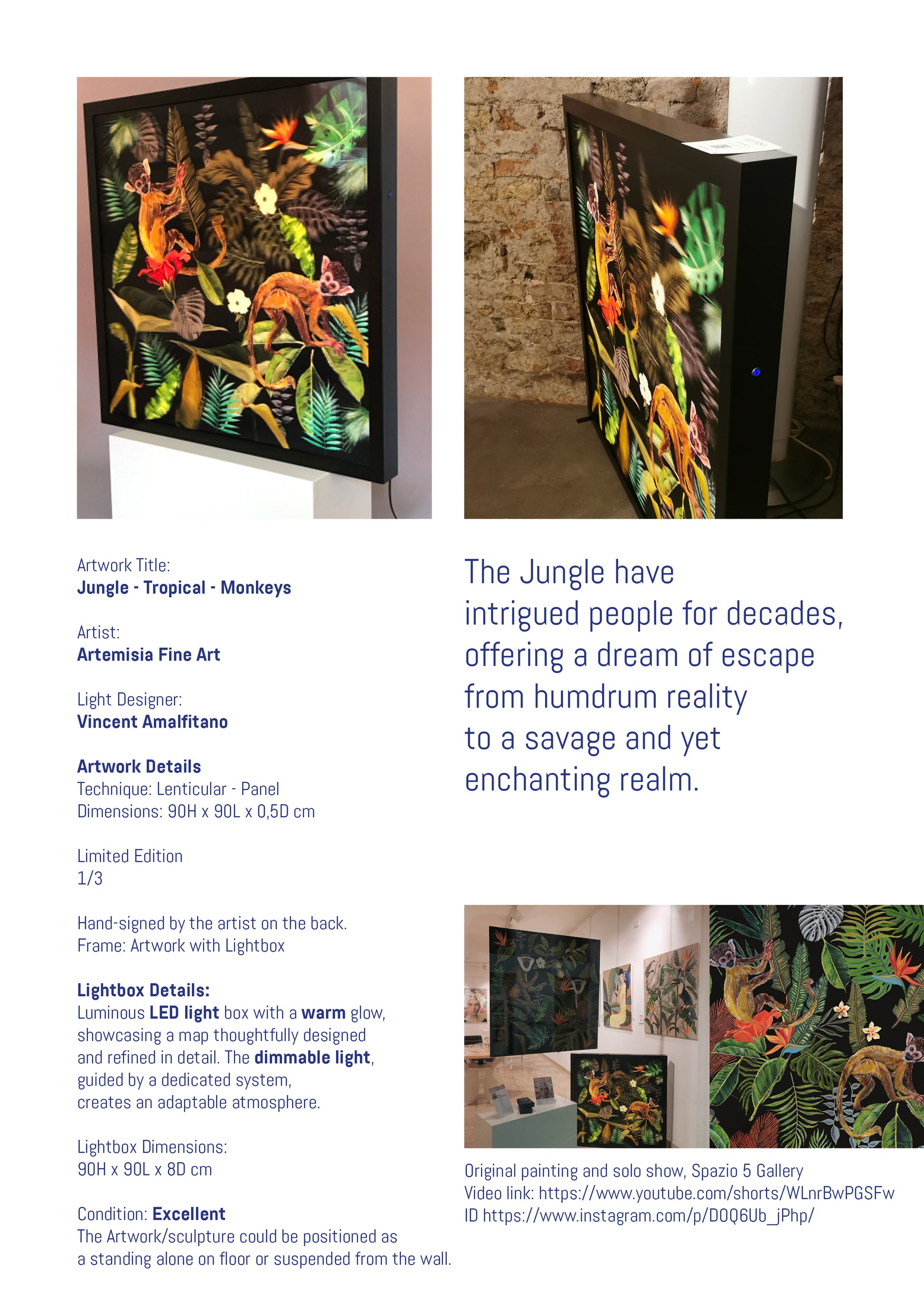 Integrated Lighting System: each work is equipped with a mapped lighting design, dimmable via soft-touch and remotely controlled, specifically developed to highlight the play of light and movement inherent to lenticular art, seamlessly adaptable to sophisticated environments and perfectly aligned with the elegance and innovation of your projects.