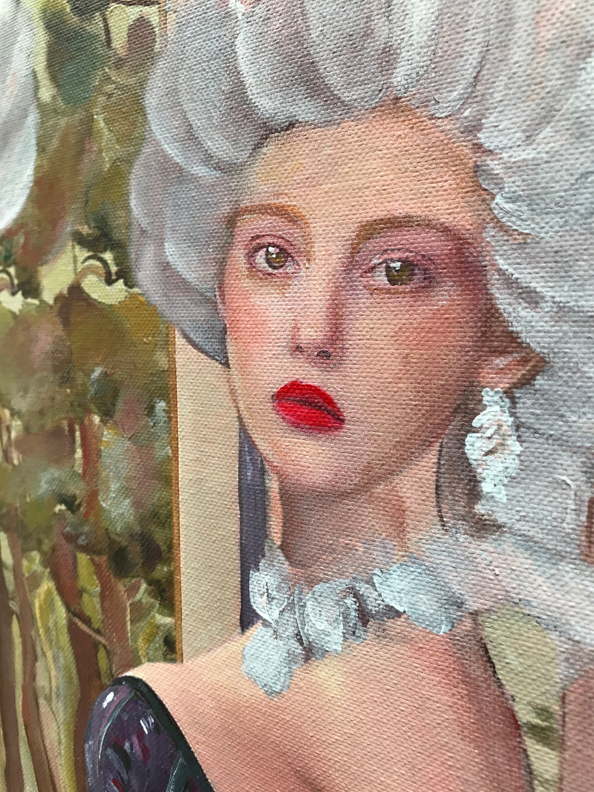 Dimensions are 110H x 80L cm. Large scale composition painting on Canvas. Satin varnished protection. The colors are bright and vibrant.