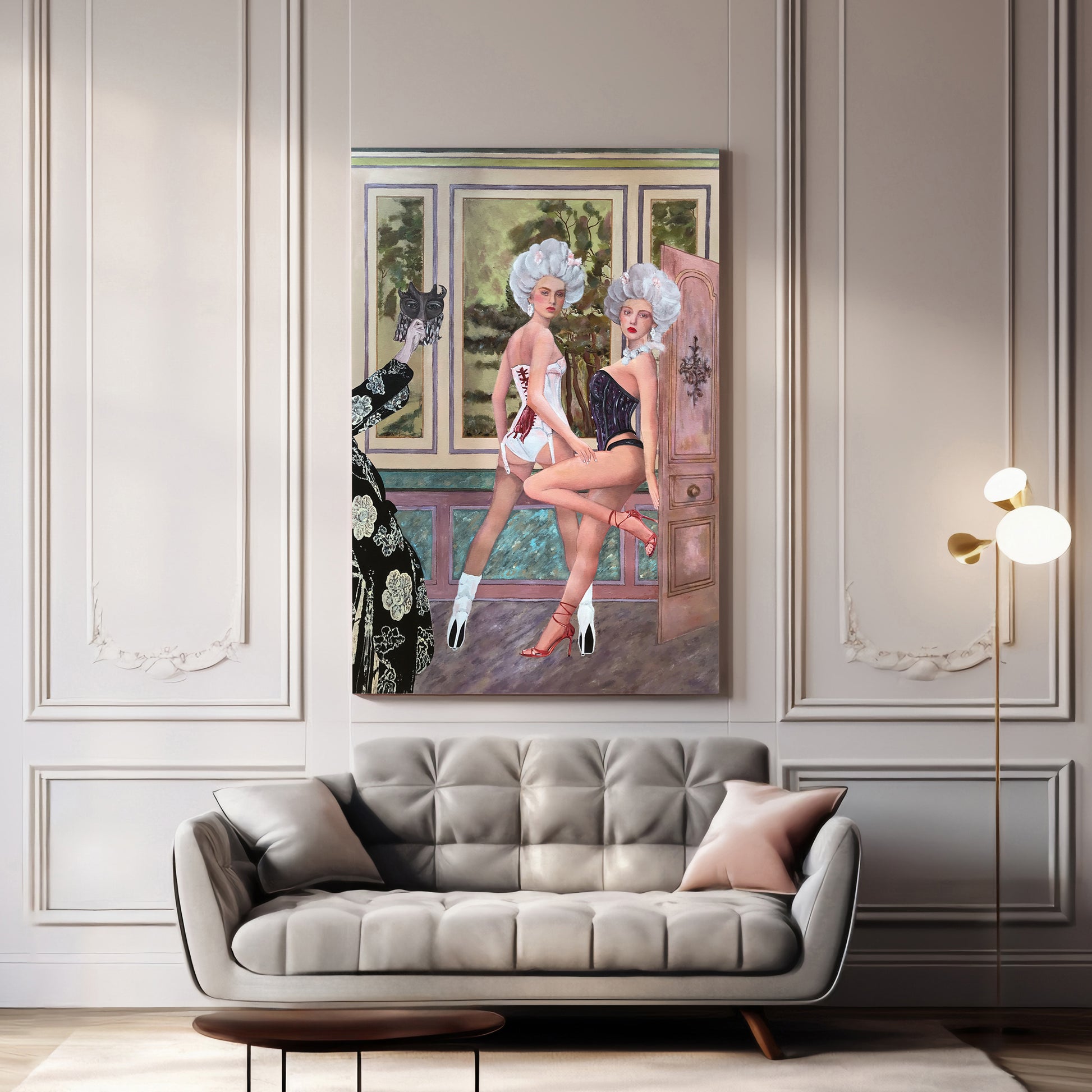 Corsets shape their bodies with theatrical grace, turning them into elegant, almost unreal forms. Their gazes rest upon the viewer, intense and ambiguous, like unspoken promises. At the margins, an unexpected visitor lifts a mask, a silent observer of a scene that does not belong to him. Everything vibrates with a subtle theatricality, where beauty reveals and defends itself under a quiet, watchful gaze.