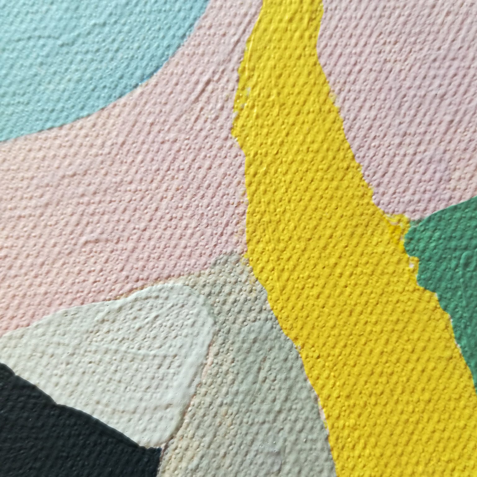 Dimensions are 100 x 100 cm, with 4-5 cm white canvas borders for assembly. Traditional media composition on Canvas, acryl and oil. Satin Matt Varnished UV protection.