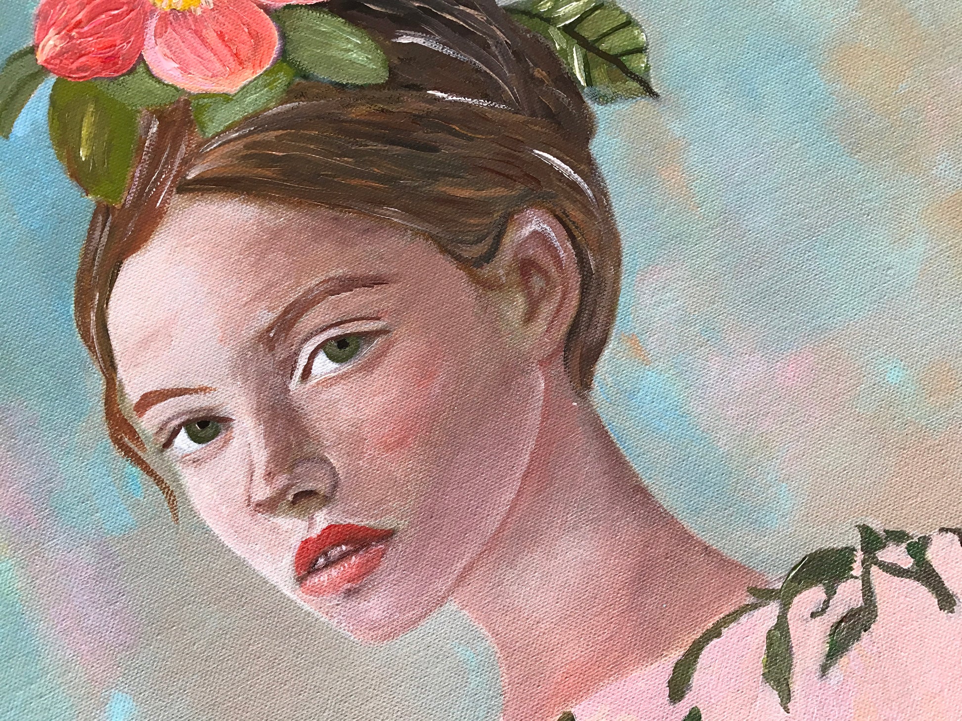 A delicate pictorial work that celebrates the beauty of nature through the encounter between the floral world and the human realm. The two women, dressed in garments covered with colorful flowers, emerge as ethereal figures, suspended in a dreamlike and poetic atmosphere. Their serene faces and floral headdresses evoke a sense of harmony and rebirth, as if nature itself had merged with their very essence.