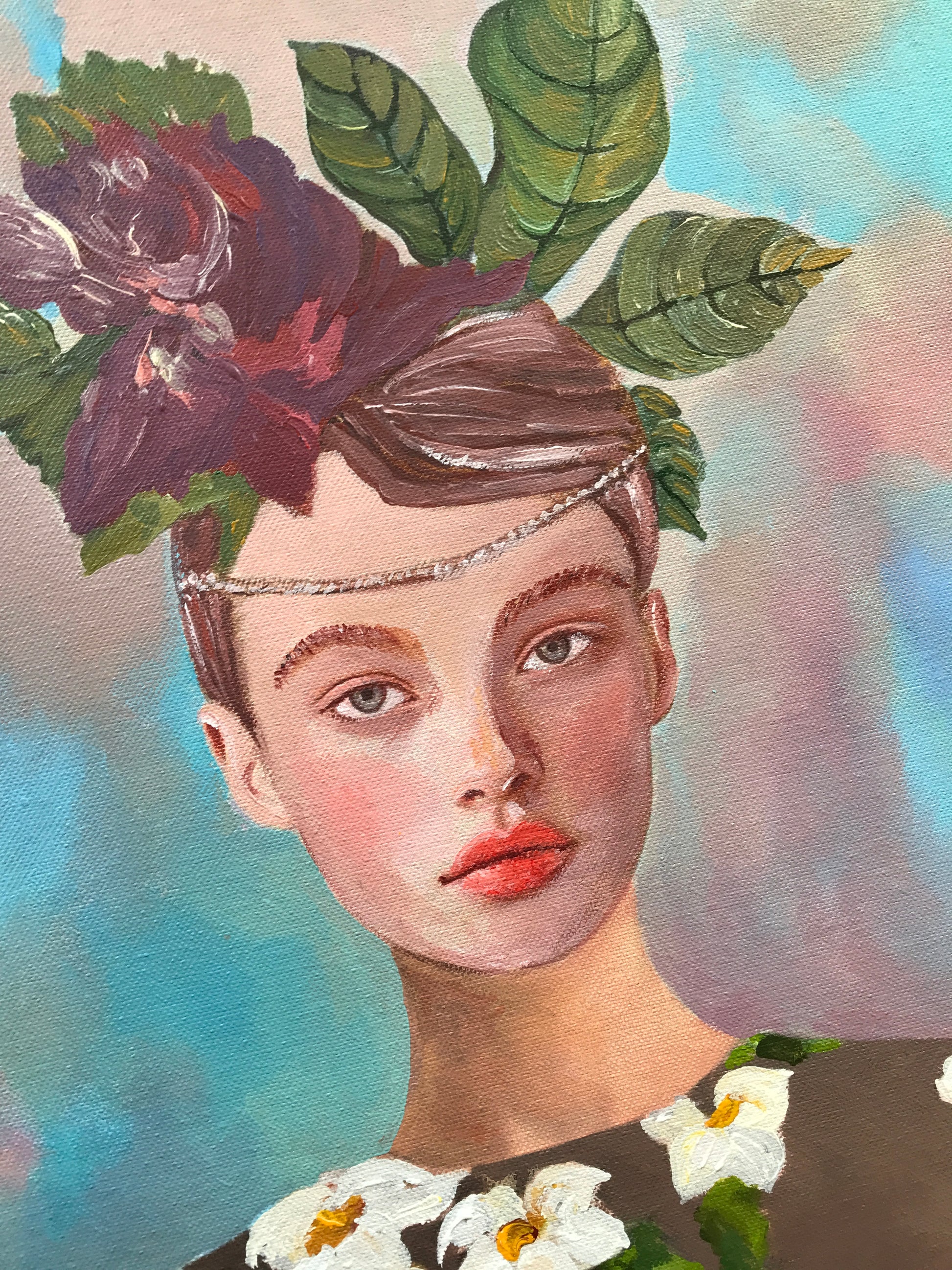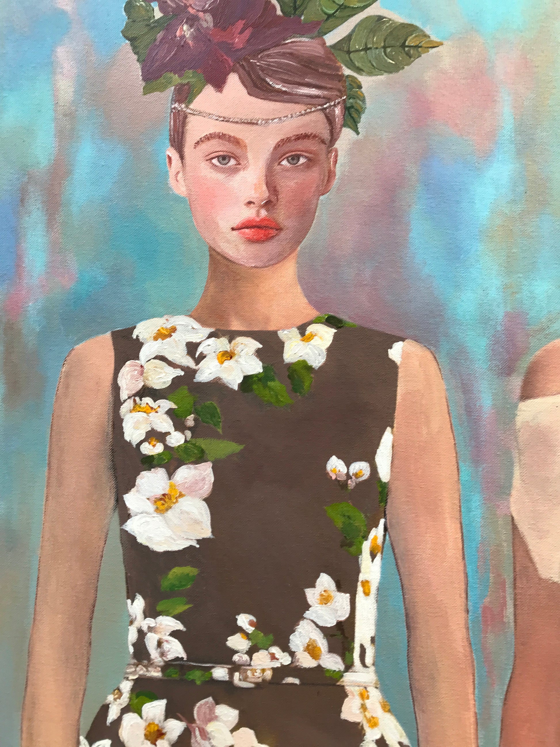A delicate pictorial work that celebrates the beauty of nature through the encounter between the floral world and the human realm. The two women, dressed in garments covered with colorful flowers, emerge as ethereal figures, suspended in a dreamlike and poetic atmosphere. Their serene faces and floral headdresses evoke a sense of harmony and rebirth, as if nature itself had merged with their very essence.