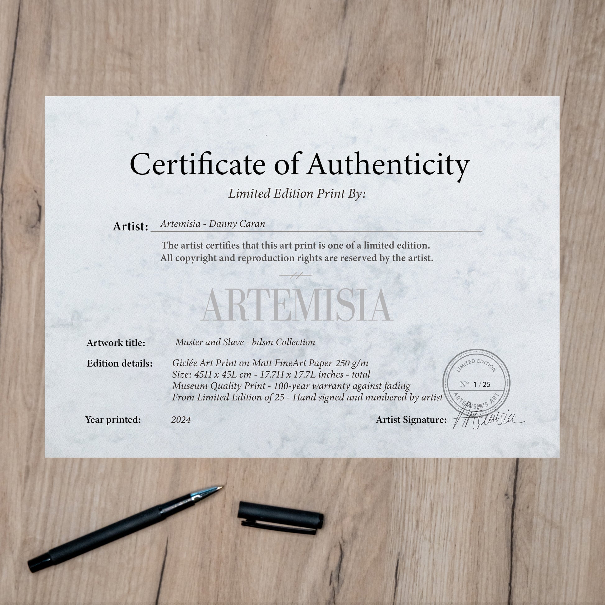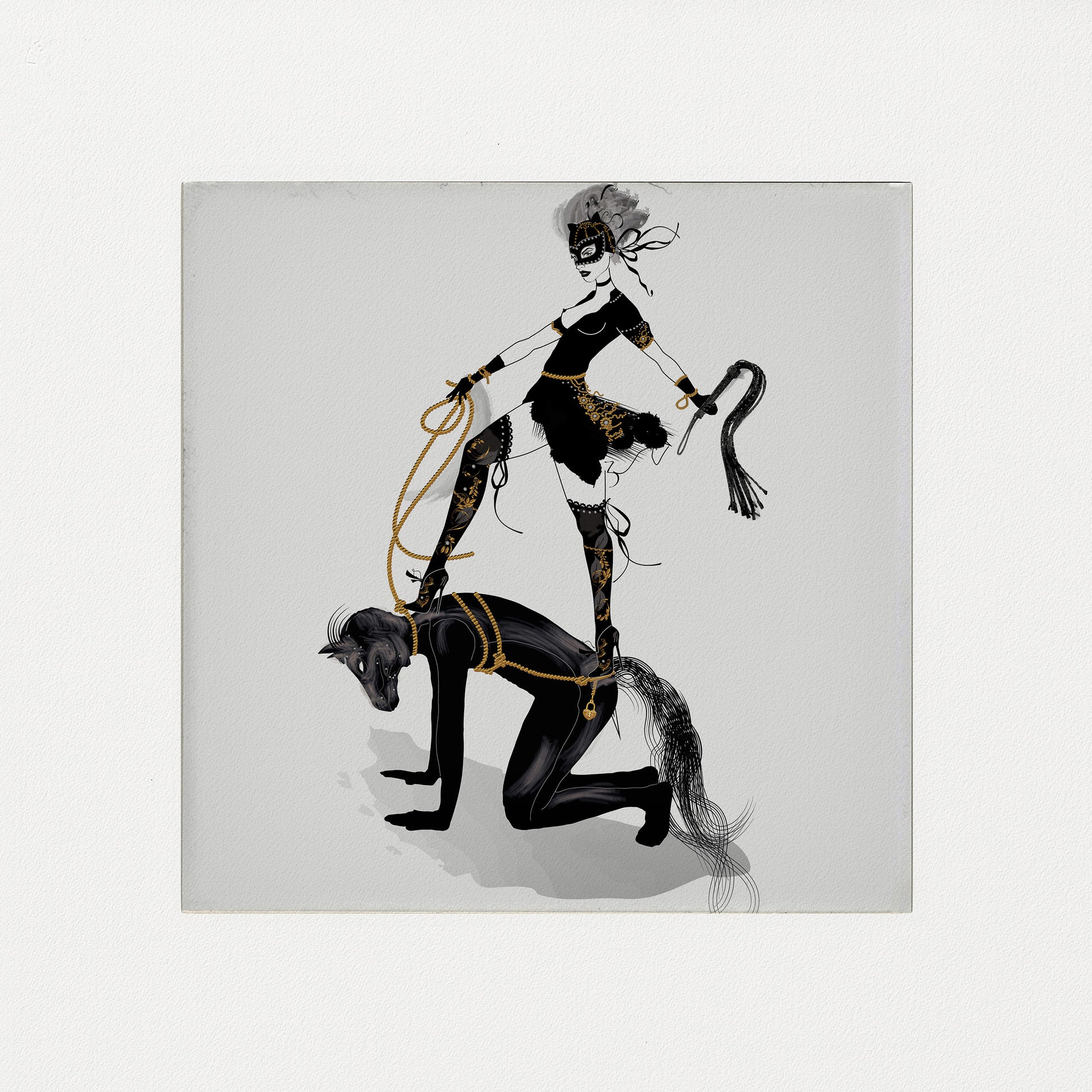 Giclée Art Print of Authentic piece made with passion and golden embroidery details. Playful illustration in bdsm style. The Artprint comes with certificate of authenticity signed by Artemisia.