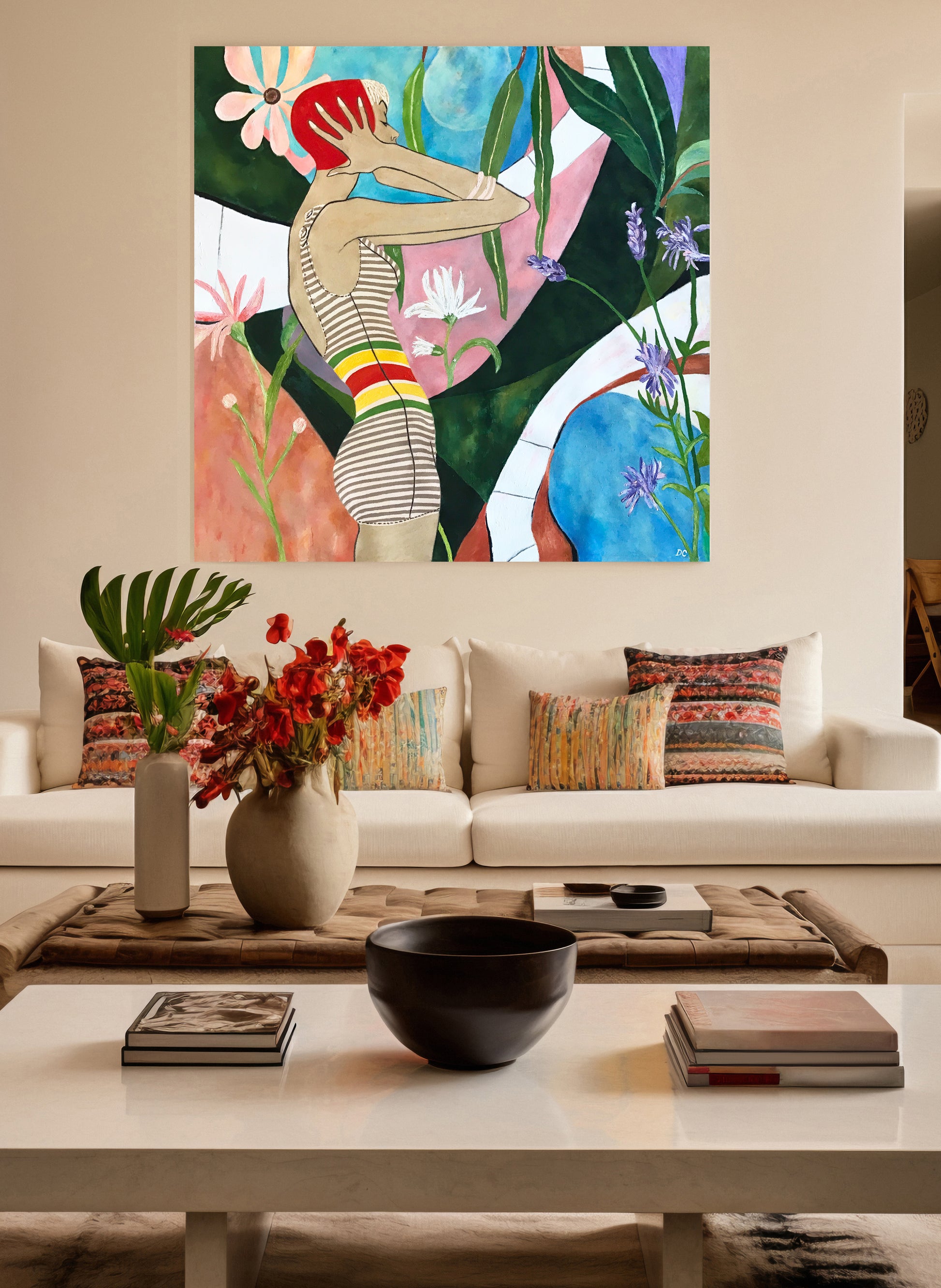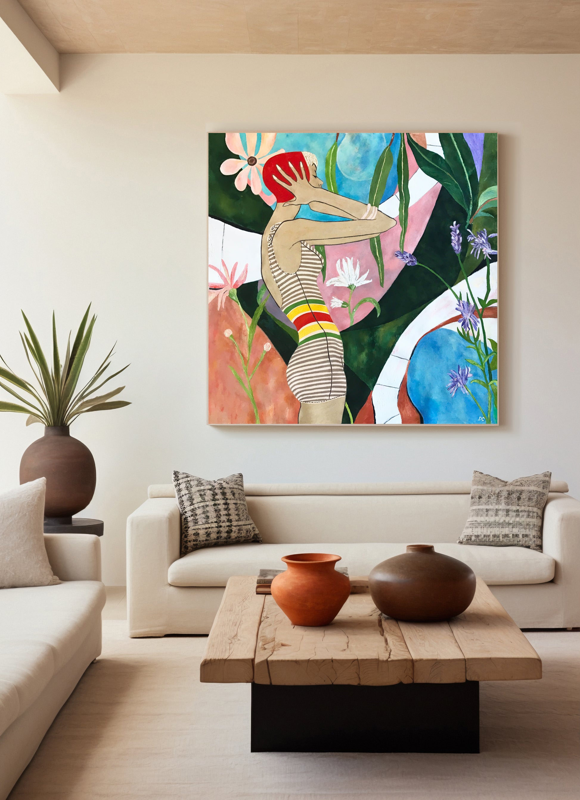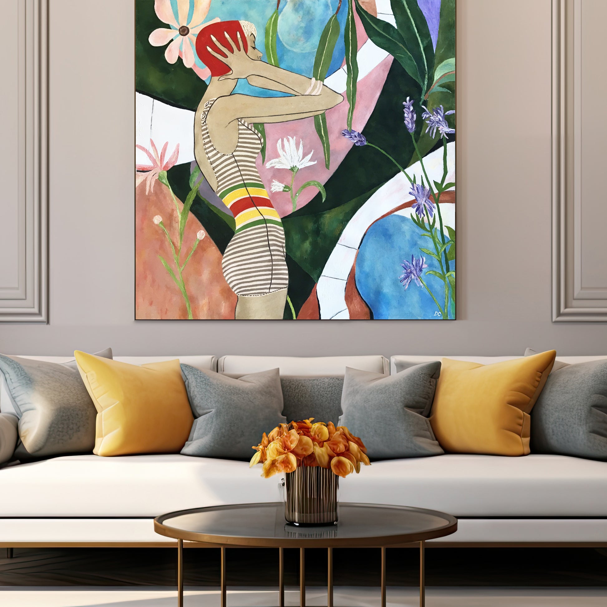 A celebration of summer's vitality "Summer Blooms", where nature blossoms in harmony with the female figure. The vibrant colors and delicate flowers evoke the warmth, freedom, and beauty of the season. Time seems suspended, wrapped in the gentle breeze of endless afternoons. A silent dialogue between body and nature, where life blooms with quiet intensity.