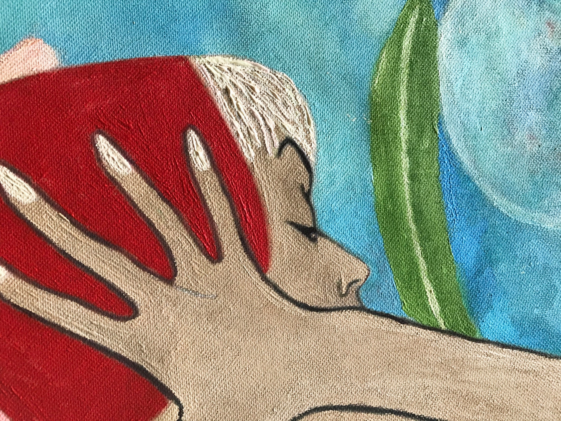 Dimensions are 85H x 85L cm. Large scale composition painting on Canvas. Satin varnished protection. The colors are bright and vibrant in contrast with elegant black background.