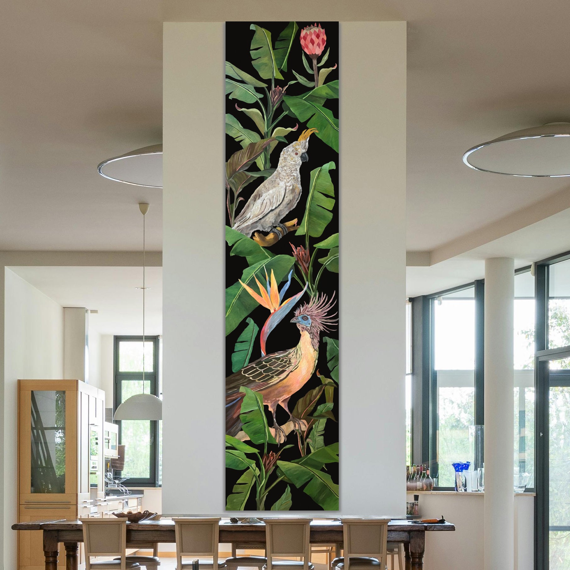 Dimensions are 193H x 43L cm. Large scale Jungle composition painting on Canvas. Satin varnished protection. The colors are bright and vibrant in contrast with elegant black background.