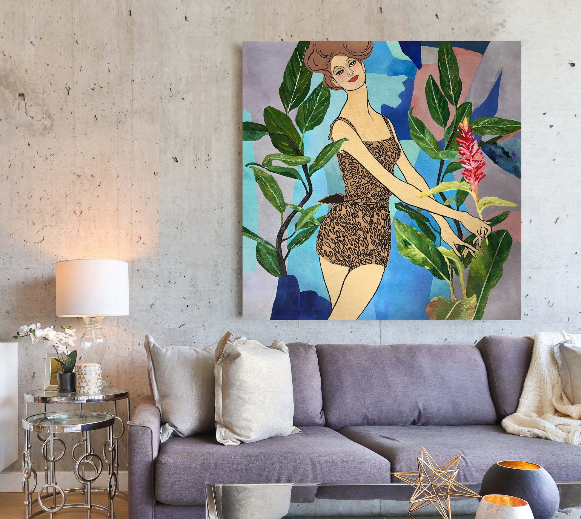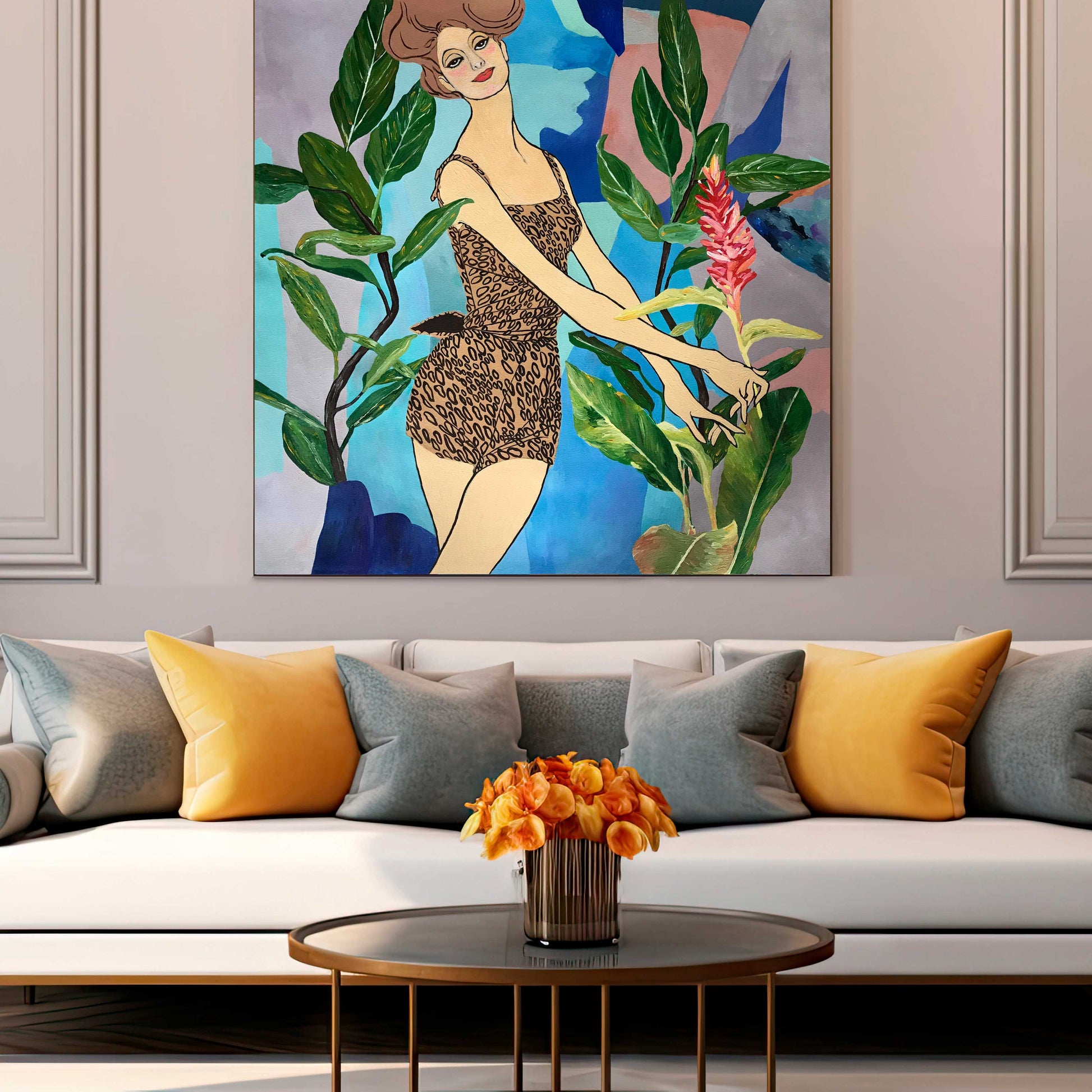 Amid lush leaves and vibrant colors, a graceful figure moves as if following the secret rhythm of the jungle. The warm breeze caresses her hair while her leopard-print outfit blends seamlessly with the wild surroundings. With an exotic flower between her fingers and an enigmatic smile, she seems like the queen of a secret dance, reserved only for those who can hear the hidden music of the plants. The background is an explosion of fresh and warm tones, a vibrant mix of deep blues and sun-kissed hues, enriched with lush tropical plants and exotic flowers. The atmosphere evokes the carefree spirit of Mediterranean vacations, capturing a timeless glamour reminiscent of fashion icons from the 1950s and 1960s.
