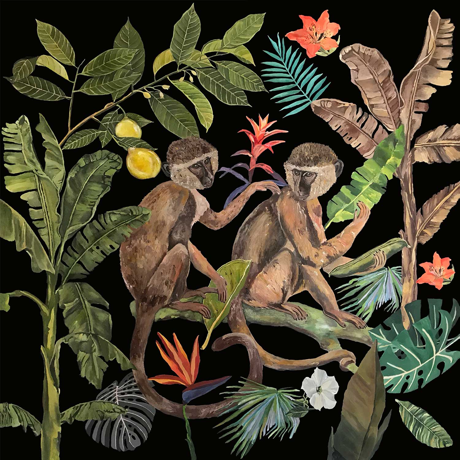 The Jungle have intrigued people for decades, offering a dream of escape from humdrum reality to a savage and yet enchanting realm. Two Macaques is Authentic piece, art tailored to bring Natural and Tropical Elements to your Living Space. The colors are bright and vibrant in contrast with elegant black background.