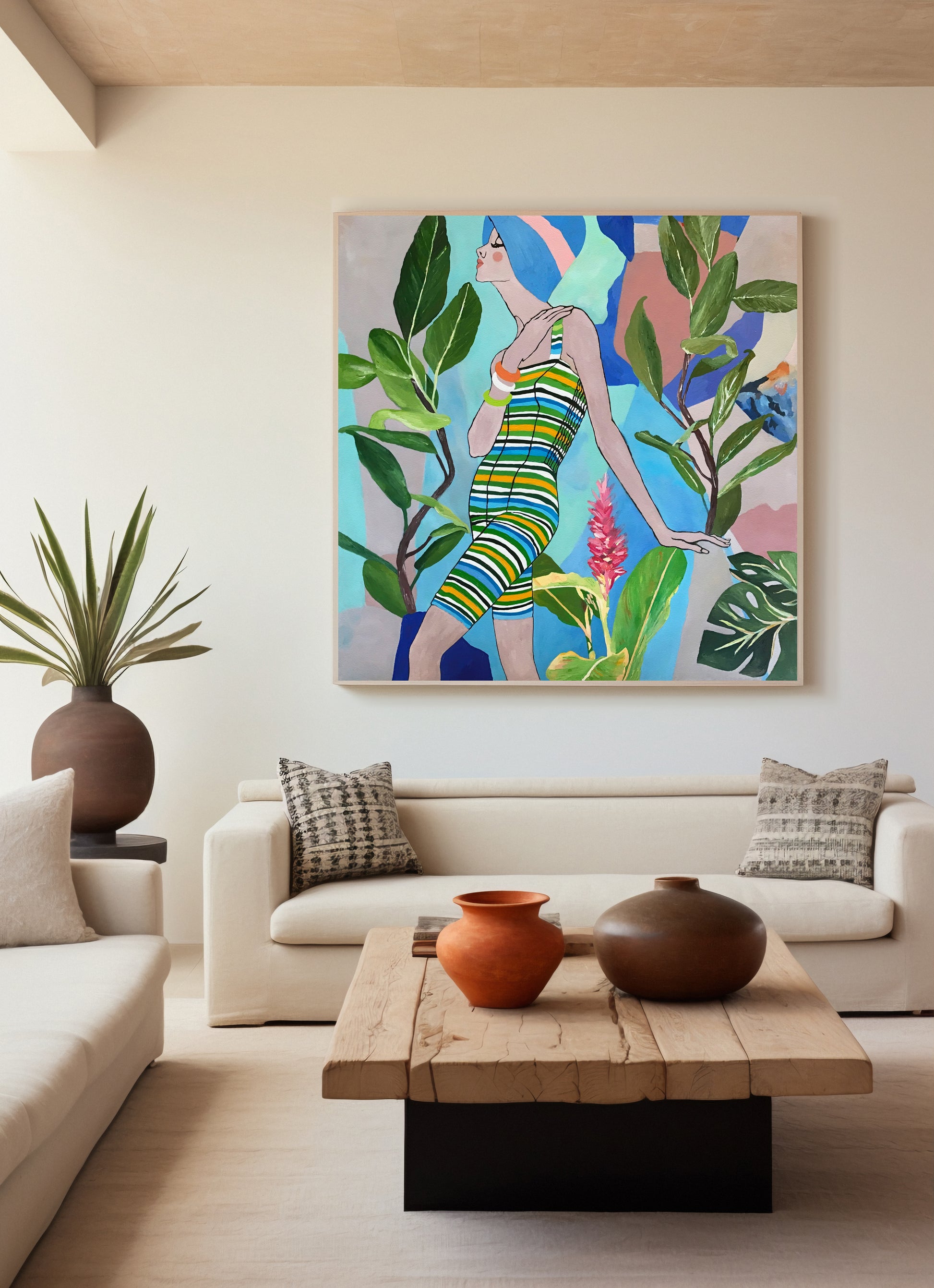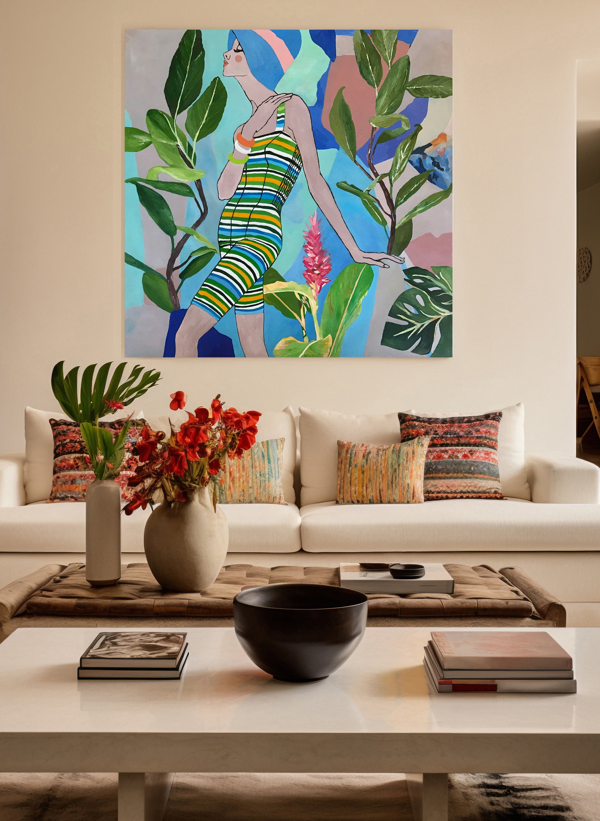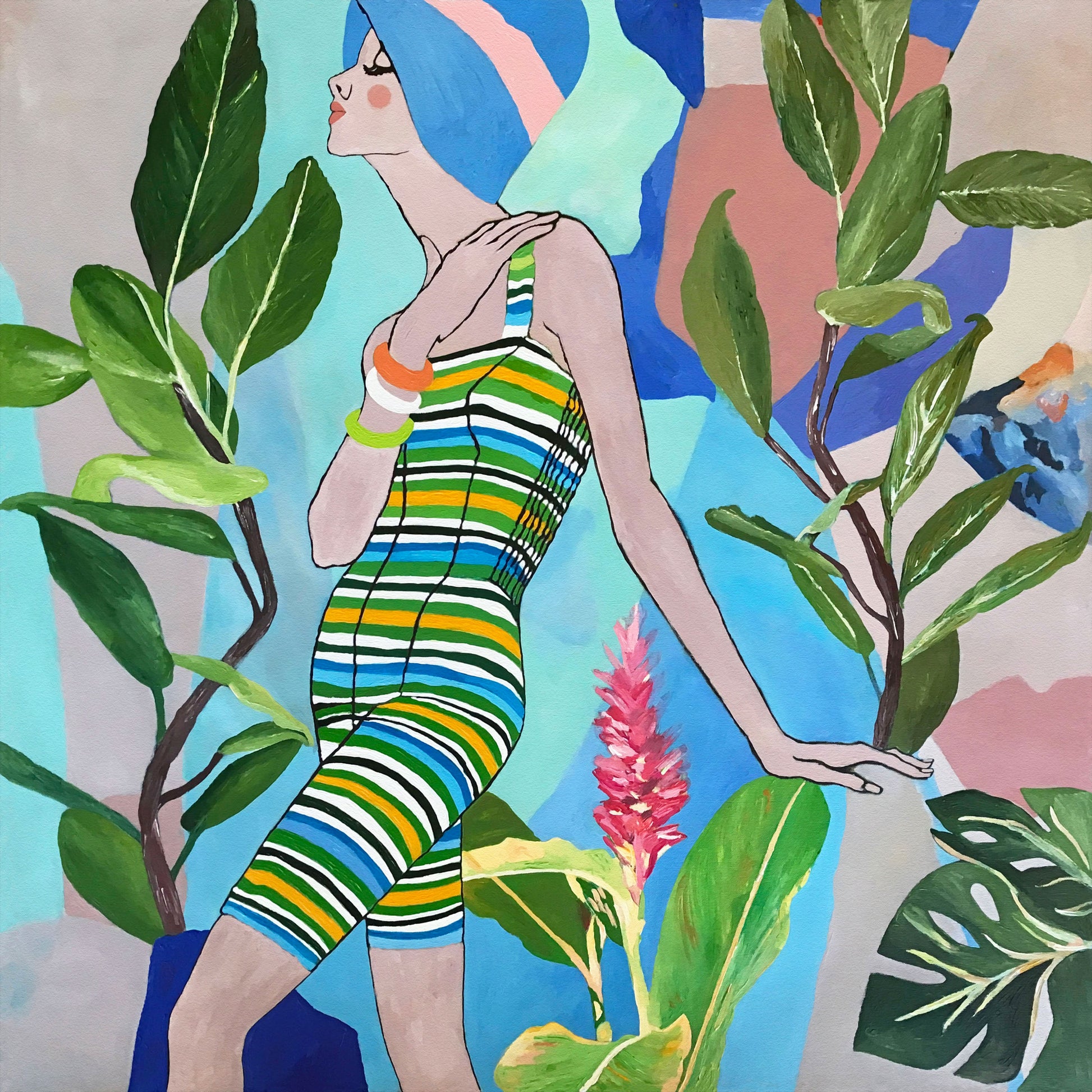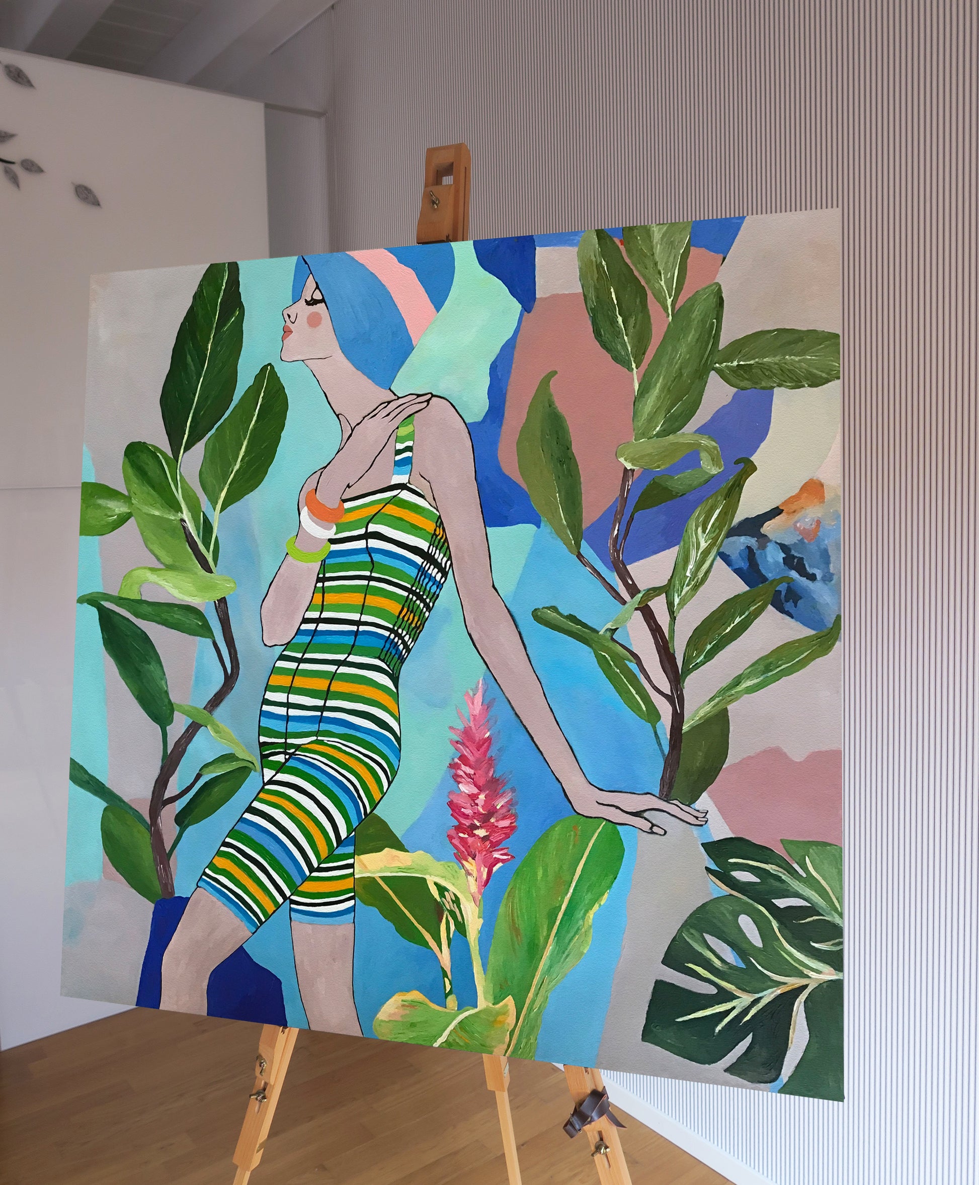 Under the Blue Hat is a burst of tropical colors featuring a chic protagonist who seems to say, "I'm on vacation, what about you?" With her rainbow-striped outfit, a diva-like pose, and an impeccable blue hat, she blends in (but not too much) among giant leaves and a red flower cheering for her style. It's like the perfect selfie taken in the jungle... pure relaxation vibes!