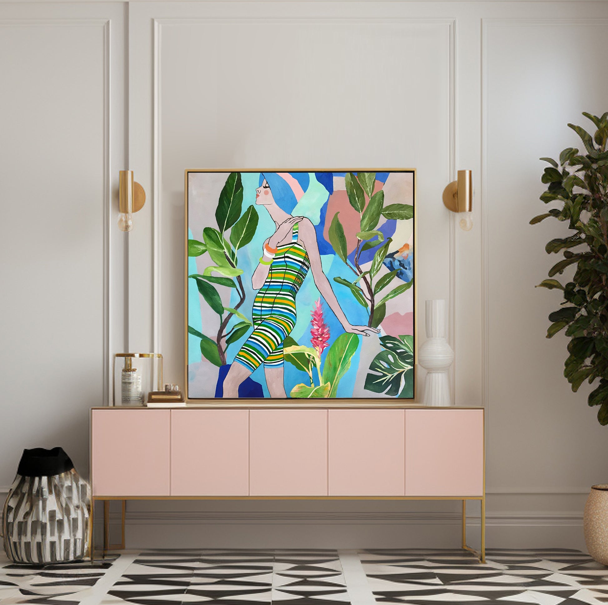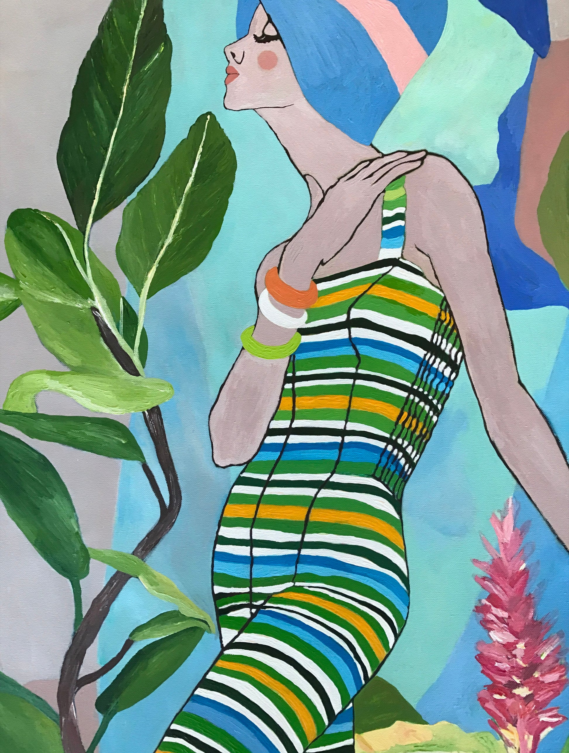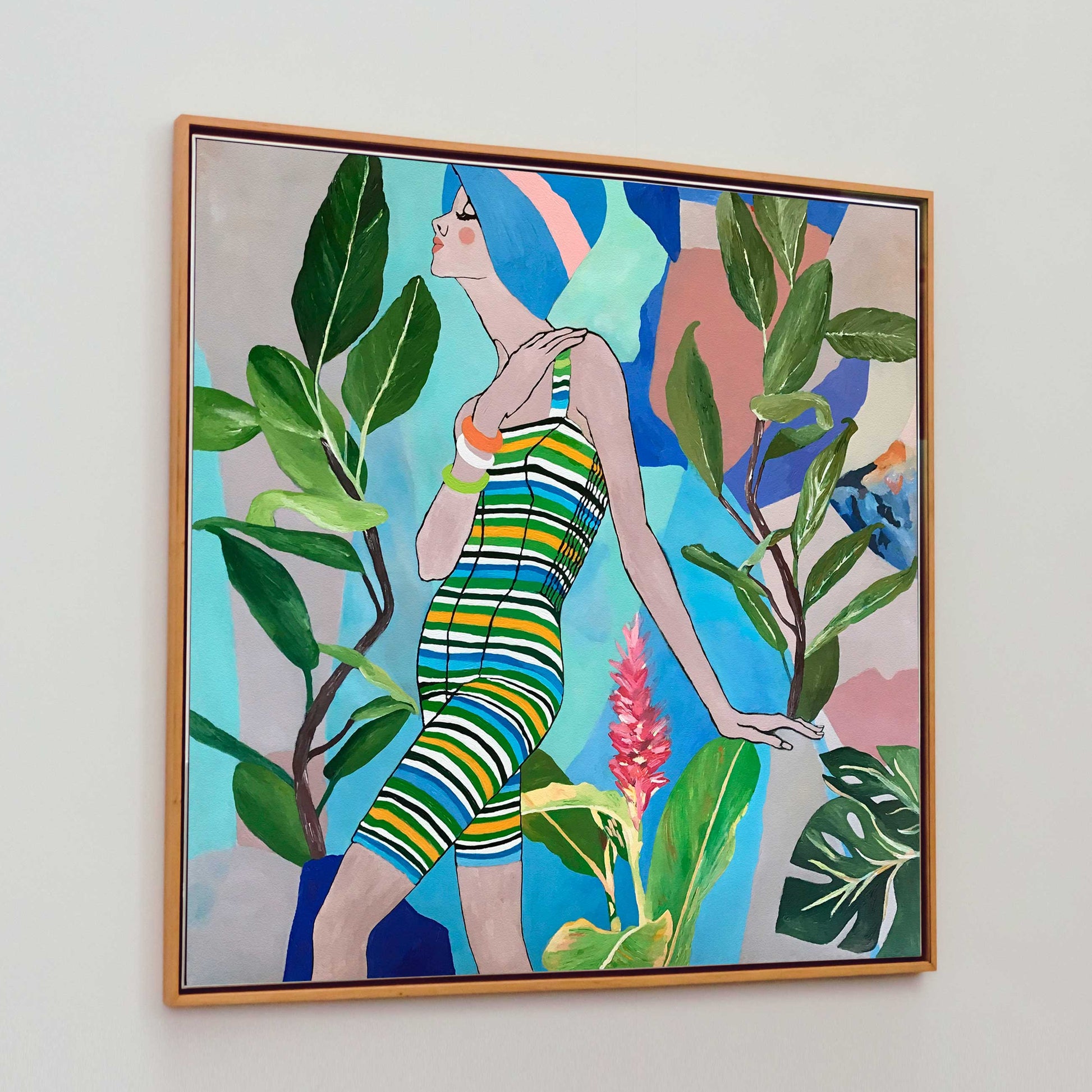 Under the Blue Hat is a burst of tropical colors featuring a chic protagonist who seems to say, "I'm on vacation, what about you?" With her rainbow-striped outfit, a diva-like pose, and an impeccable blue hat, she blends in (but not too much) among giant leaves and a red flower cheering for her style. It's like the perfect selfie taken in the jungle... pure relaxation vibes!