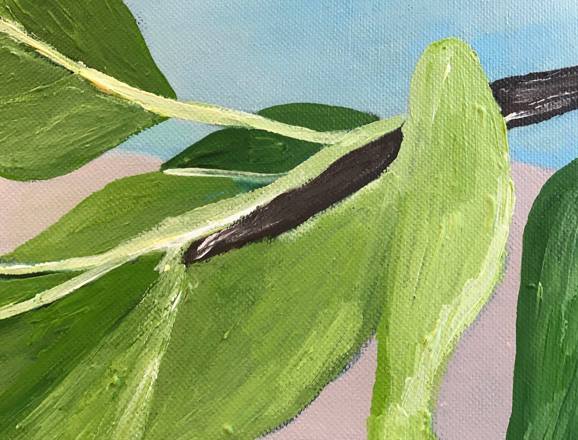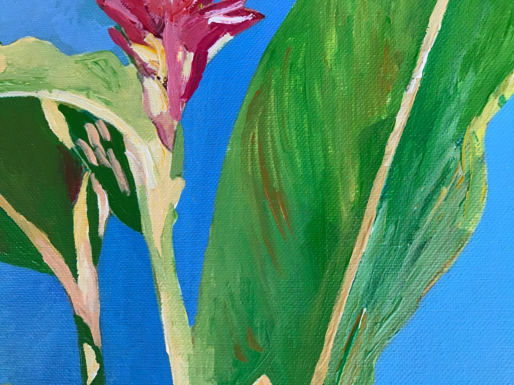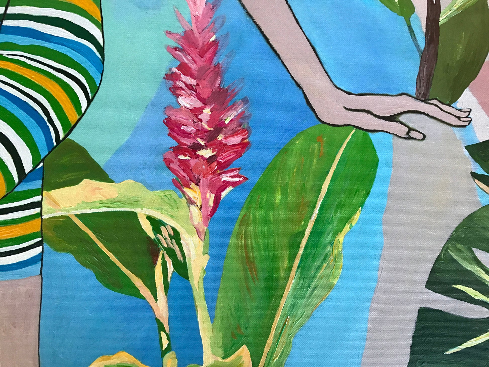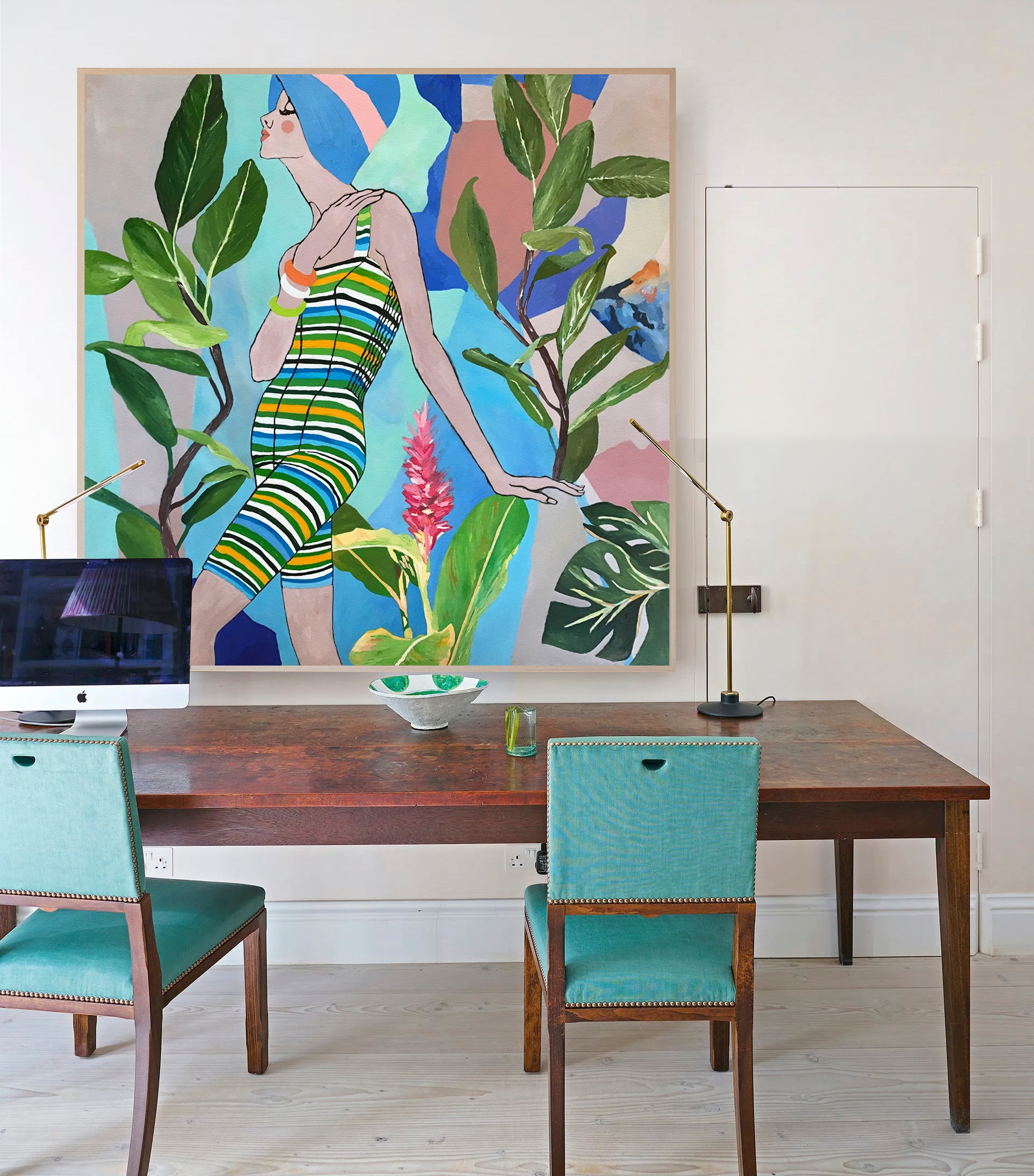 Under the Blue Hat is a burst of tropical colors featuring a chic protagonist who seems to say, "I'm on vacation, what about you?" With her rainbow-striped outfit, a diva-like pose, and an impeccable blue hat, she blends in (but not too much) among giant leaves and a red flower cheering for her style. It's like the perfect selfie taken in the jungle... pure relaxation vibes!